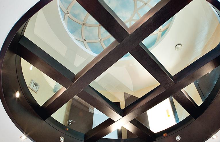 Изюминкой особняка стало окно-иллюминатор, отделяющий первый и второй этажи. Оригинальная задумка в интерьере родилась после того, как бетонный пол уже был сконструирован. Строителям пришлось изрядно постараться, чтобы «прорубить» бетон толщиной в 40 см. Зато через получившееся окно можно увидеть необычную роспись, находящуюся на потолке верхнего этажа. Получилось красочно, необычно и завораживающе.
