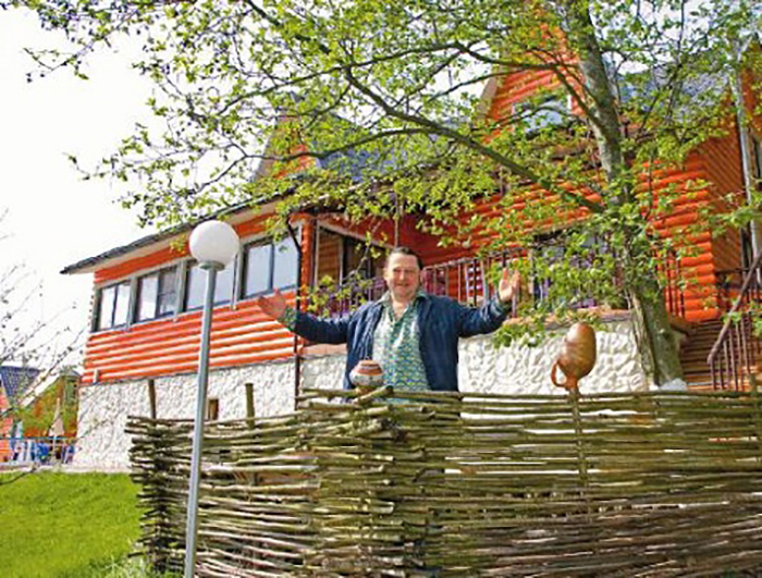 Двухэтажный особняк выполнен из камня и дерева. Краска только на водной основе. Музыкант отнесся к строительству дома легко и просто. Привлек бригаду строителей, проверенных ребят, которые строили соседний дом, просто нарисовал эскиз дома, основываясь на своих желаниях и мечтах. А строители уже воплощали идеи Игоря в реальность.
