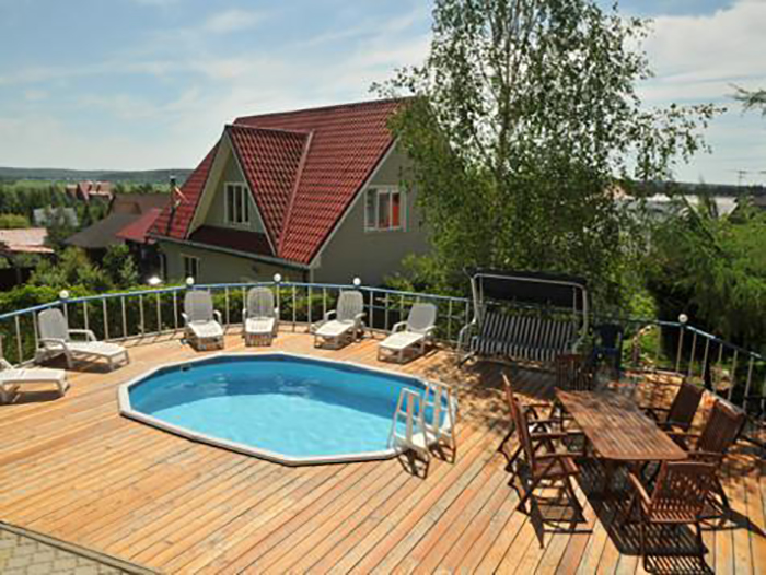 На заднем дворе расположилась огромная терраса с бассейном, столом для посиделок и гостеприимными лежаками для хозяев и их гостей.