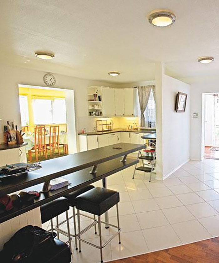 На первом этаже расположены гостиная и кухня. Стены декорированы в белый цвет, встроенный свет на потолке еще больше раздвигает пространство. Кухня зонирована на барную зону и зону готовки. Большая арка отделяет столовую от кухни.