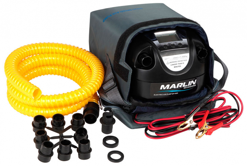 Электрический двухступенчатый компрессор Марлин 80GP и GP 80D–практичная силовая установка для подачи и выкачивания воздуха к надувной лодке ПВХ. Для работы агрегата необходим переносная батарея или автомобильный аккумулятор.