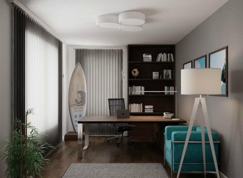 Кабинет хозяина многозначительно указывает на хобби — занятия серфингом. Эта комната также ничем не перегружена и оформлена в контексте с общим цветовым решением. Только яркий акцент в виде бирюзового кресла выбивается из темы.