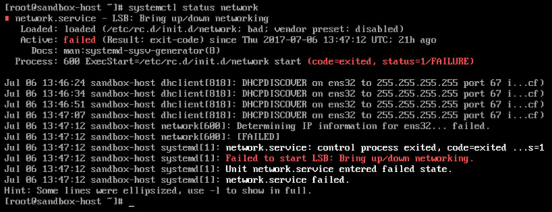 ● network.service – LSB: Bring up/down networking Loaded: loaded (/etc/rc.d/init.d/network) Active: failed (Result: exit-code) Docs: man:systemd-sysv-generator(8) Process: 1962 ExecStart=/etc/rc.d/init.d/network start (code=exited, status=1/FAILURE) CGroup: /system.slice/network.service └─2731 /sbin/dhclient -H localhost -1 -q -lf /var/lib/dhclient/dhclient-3cc8dfc3-a3e8-483… localhost.localdomain dhclient[2976]: No DHCPOFFERS received. localhost.localdomain network[1962]: Determining IP information for enp130s0f0… …d. localhost.localdomain network[1962]: [FAILED] localhost.localdomain network[1962]: Bringing up interface enp130s0f1: localhost.localdomain network[1962]: Determining IP information for enp130s0f1… …e? localhost.localdomain network[1962]: [FAILED] localhost.localdomain systemd[1]: network.service: Control process exited, code=e…s=1 localhost.localdomain systemd[1]: Failed to start LSB: Bring up/down networking. localhost.localdomain systemd[1]: network.service: Unit entered failed state. localhost.localdomain systemd[1]: network.service: Failed with result 'exit-code'.