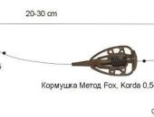 - Инлайн с кормушкой флэт-метод. Данная оснастка используется на стоячих озерах и прудах. Особенно популярна на платниках, где не нужно далеко бросать, поскольку при дальних забросах, велика вероятность перехлеста повадка с основной леской или кормушкой. Является одной из основных фидерных оснасток на карпа.