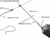 - кормушка закрепляется к отводу через вертлюг, расположенный на основной леске. Хорошо работает на течении.