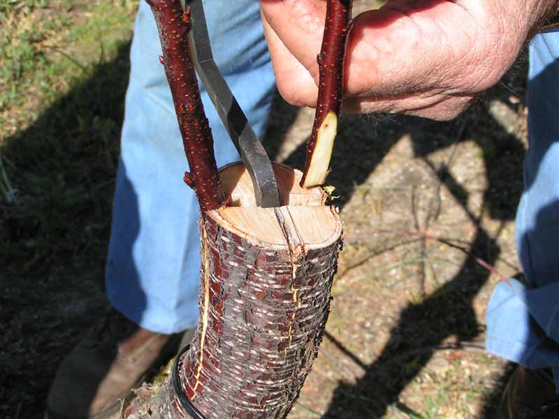 Теперь подготавливаем правильный срез на дички яблони. Для этого нужно сделать Т-образный разрез на коре, но глубине прорезать нельзя. Поэтому сначала делаем поперечный разрез, а затем продольный разрез.