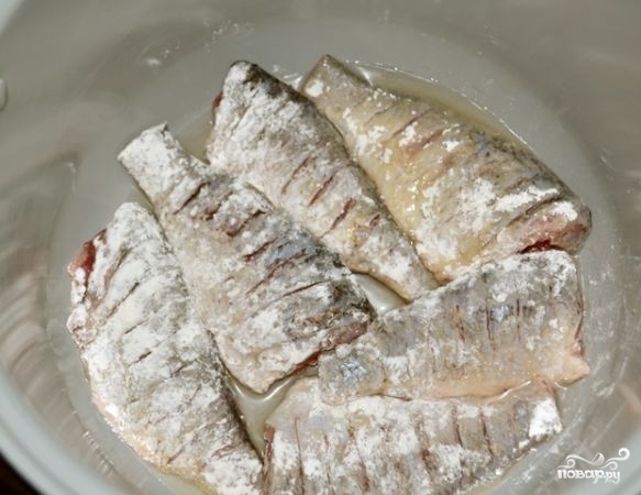 Насыпать в тарелку муку, вывалять в ней всех карасей и обжарить в мультиварке до золотистого цвета с обеих сторон.
