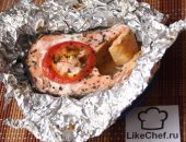 Ингредиенты: 2 стейка форели, 200 мл сметаны, 50-70 г твёрдого сыра, 1 сладкий перец, 1 спелый помидор,