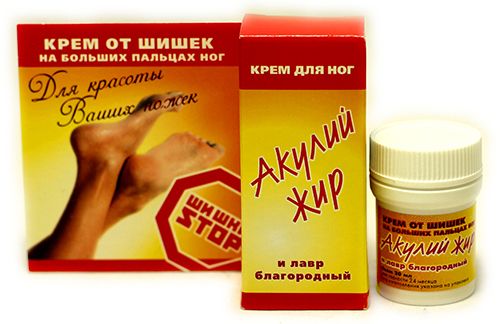 Акулий жир может содержаться в различных аптечных препаратах, так как вещество это универсально полезно. Следует искать такой препарат, на упаковке которого значится: мазь от шишек на ногах.