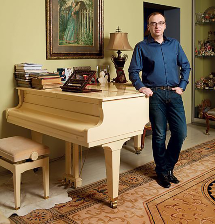В интерьере гостиной, выполненной в английском стиле конца XIX-начала XX столетия, выделяется белый электрокамин с роскошной вазой и подсвечниками. Рядом — картина «Портрет неизвестного», привезенный из Ливана. Нельзя не заметить некоторого сходства человека на полотне с владельцем квартиры.