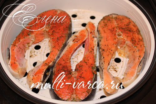 Лосось нарезать на одинаковые кусочки, тщательно промыть и промокнуть, удаляя лишнюю влагу. Каждый отдельный кусочек натирают солью и опускают в домашний маринад на основе цитрусового сока. Необходимо оставить в нем рыбу на полтора часа. После рыбу перекладывают в мультиварку и готовят в режиме «На пару».