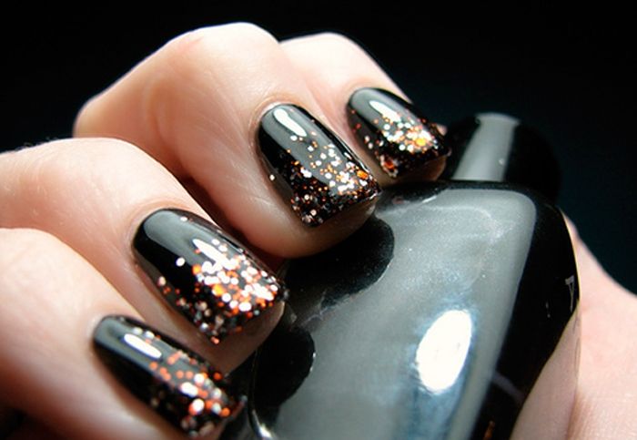 Также можно сделать легкий блестящий горизонтальный градиент. Для этого на свободный край поверх черного лака наносится шимерный или глитерный золотой лак. И пока он свежий, его нужно растянуть до середины ногтя.