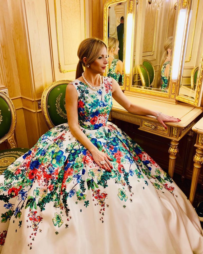 Кухня плавно переходит в гостиную. Здесь помещение заполнено дорогой антикварной посудой. На полу стоят высокие черные вазы с любимыми цветами Юлии — белыми орхидеями. Разделяют пространство классические колонны темно-бежевого цвета. Возле них красуются золотистые настенные торшеры, создающие богатую обстановку в комнате.
