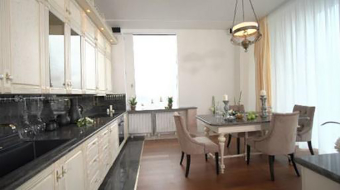 По задумке дизайнера для столовой изначально подбирался круглый стол. Но следуя за чёткими и простыми линиями, авторы решили установить роскошный квадратный стол из массива дерева с гранитной столешницей весом 150 кг.