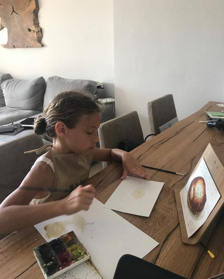 В гостиной комнате соорудили большой письменный стол, чтобы все дети одновременно могли за него уместиться, занимаясь каждый своим любимым занятием. Для гостей выделили просторный угловой диван дымчатого оттенка. Над ним висит оригинальное деревянное панно, стильно гармонирующее с мебелью в помещении.