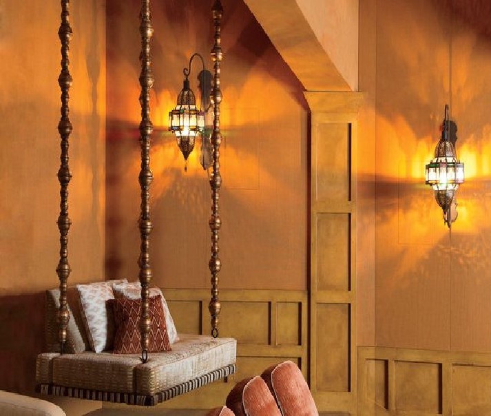Не менее экзотична и спальня супругов, выполненная также в коричнево-оранжевых тонах. Над кроватью подвешен балдахин из цепочек. Интерьер дополняют тумбы, мягкие кресла с журнальным столиком, будуар.
