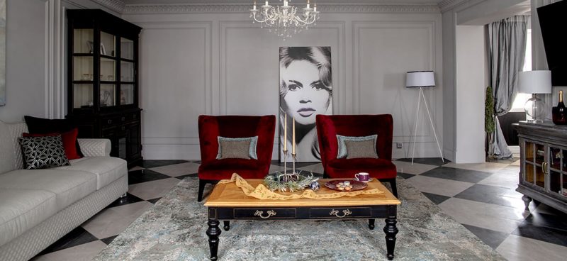 Дизайном этих комнат занималась программа «Идеальный ремонт». Мягкие кресла Марсель бордово-красного цвета сыграли на повышение выразительности интерьера. Белоснежный диван выполнен в стиле Ар-деко. Журнальный столик с резными ножками из дуба удачно сочетается с темными деталями дизайнерских кресел.