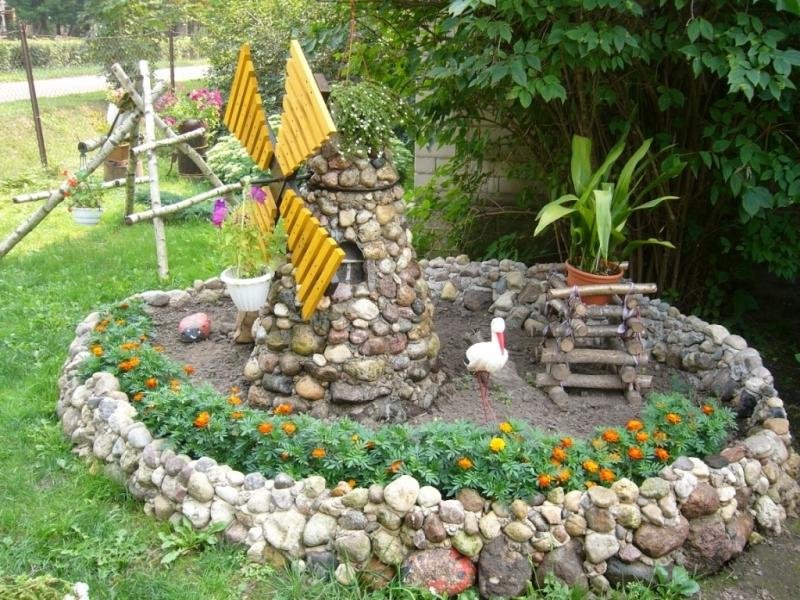 Традиционный материал для клумб – кирпич и камни – также можно креативно использовать, если грамотно подобрать цветущие растения. Дорожки засыпают мелкой щебенкой, декоративным цветным камнем.