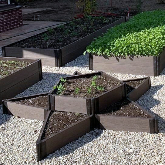 В магазинах продаются готовые комплекты, которые остается только установить в саду и наполнить грунтом. Но это слишком легко. Если необходима клумба сложной формы или нестандартного размера, придется немного поработать руками. Понадобятся сами доски из ДПК, шарниры для соединения элементов, колья для закрепления всей конструкции в земле.
