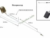 Такая снасть изготавливается из мононити или плетеного шнура толщиной 0,15−0,35 см, длиной 0,7−1 м. На основном шнуре вяжется конструкция под кормушку длиной 10−15 см.