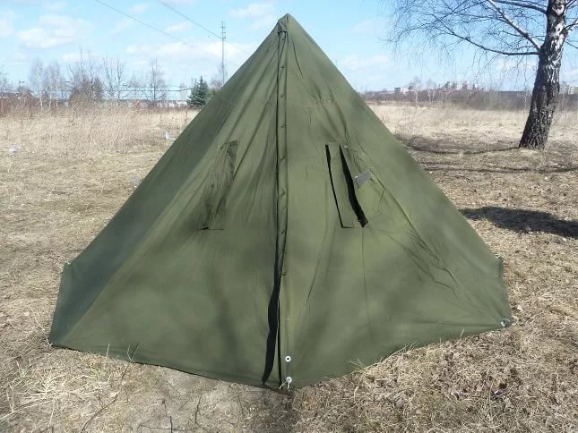 Палатки представляли собой треугольные полотнища из непромокаемых хлопчатобумажных габардинов, и употреблялись в качестве многоцелевых укрытий, подстилок, чтобы лежать на земле, а также плащей-дождевиков. С одной стороны имелось темное камуфляжное изображение, на другой — светлое.