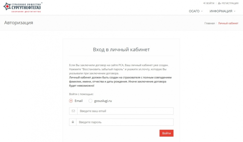 Первым делом, пользователь регистрирует новый персональный аккаунт, который потребуется ему для подачи заявления на электронный документ ОСАГО в «Сургутнефтегаз».