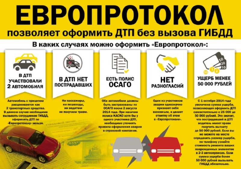 — сумма ущерба не больше 50 000 рублей (в рамках пилотного проекта для жителей Москвы, Санкт-Петербурга, Московской и Ленинградской областей — не больше 400 000 рублей, при условии фиксации аварии на устройства, поддерживающие ГЛОНАСС). Если все критерии выполнены, водители могут приступать к заполнению Европротокола