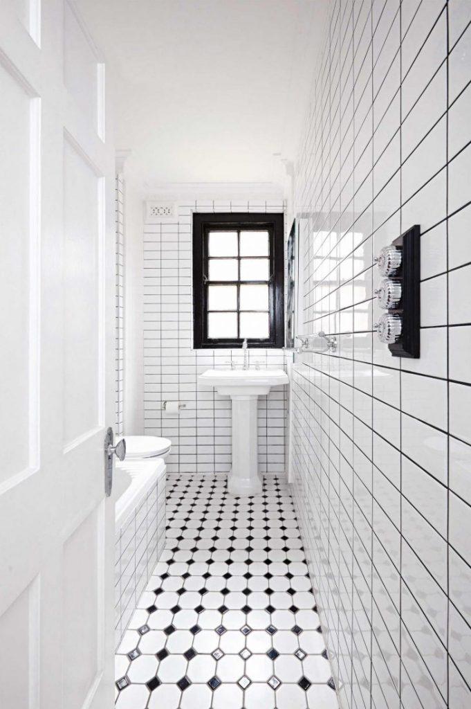 В узких прямоугольных ваннах хорошо смотрится классика — светлые оттенки.