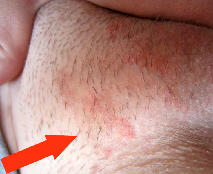 После бритья интимной зоны появляется раздражение, которое выражается покраснением кожного покрова, мелкими прыщиками и зудом, кожа шелушится. Эти явления возникают вследствие врастания волос, которое происходит по причинам:
