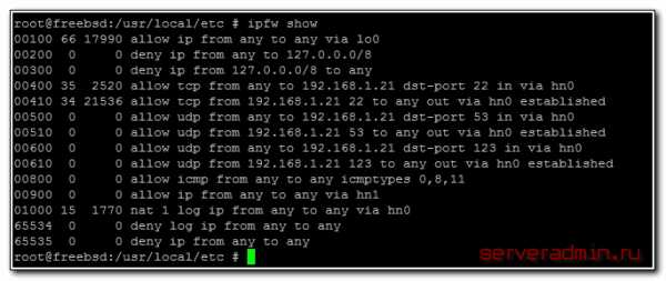 Поле того, как убедитесь, что ipfw настроен корректно, правила применятся и доступ к серверу есть, можете перевести его из открытого режима работы (последнее правило автоматически устанавливается allow all from any to any) в закрытый. Для этого в файл /boot/loader. conf добавьте строку и перезагрузите сервер: