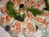 Для праздничного стола салат с малосольной красной рыбой предполагает красивый вариант оформления, когда тонко нарезанные ломтики рыбы надо скрутить, наполнить икрой, а затем выложить в форме цветка.