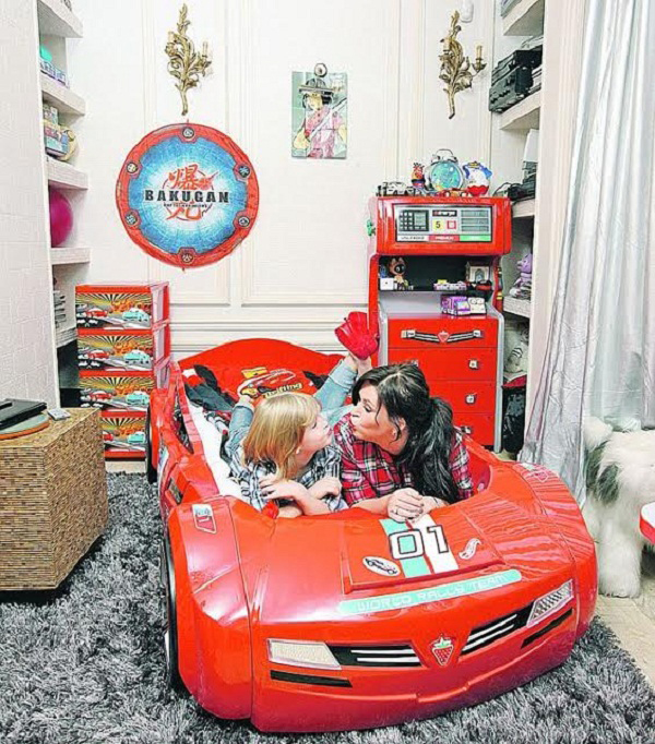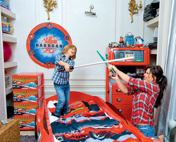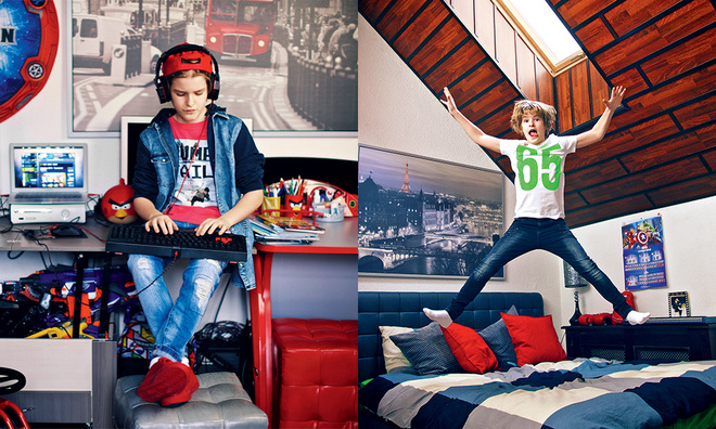 Комната сына певицы расположена в мансардном этаже. На стенах развешаны фотографии городов мира. Стол, мягкий куб-кресло, подушки на кровати – красного цвета.