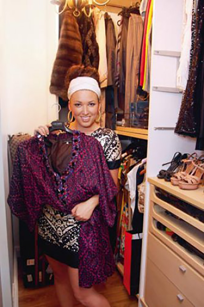 Шкафы и полки в просторной гардеробной вмещают коллекцию обуви, сумок и многочисленные элементы одежды.