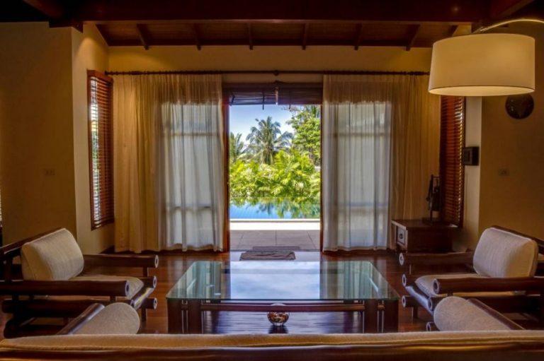 Внутри виллы уют создает контраст светлых стен с оранжево-коричневыми деревянными потолками, дверями и окнами. В гостиной установлены мебельный гарнитур из бамбука и столик со стеклянной столешницей. Окна размером со стену впускают в комнаты лучи солнечного света. Недавно эту виллу купили за 92 миллиона рублей.