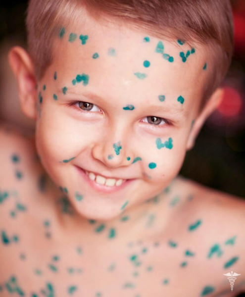 Терапия ветрянки включает меры по уходу за кожей с целью предупреждения гнойных осложнений: везикулы смазываются антисептическими растворами: 1%-й раствор бриллиантового зеленого, концентрированный – перманганата калия («зеленка», «марганцовка»).