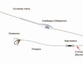 На крепкую леску сначала устанавливается отвод в виде трубочки, к этому отводу крепится кормушка, поверх кормушки бусина, а затем крепится вертлюг. Поводков на такую снасть обычно устанавливается не меньше трех.