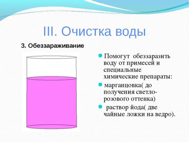 Для обеззараживания воды в небольших количествах для индивидуального потребления, как считают специалисты, наиболее эффективно применение марганцовокислого калия из расчета: на 1 литр воды несколько кристаллов (общим размером в половину спичечной головки) марганцовки до окрашивания жидкости в бледно-розовый цвет, или йода, для получения нужного эффекта будет достаточно 3-5 капель йода на литр воды. Жидкость хорошенько перемешиваем и даем отстояться полчаса — час.