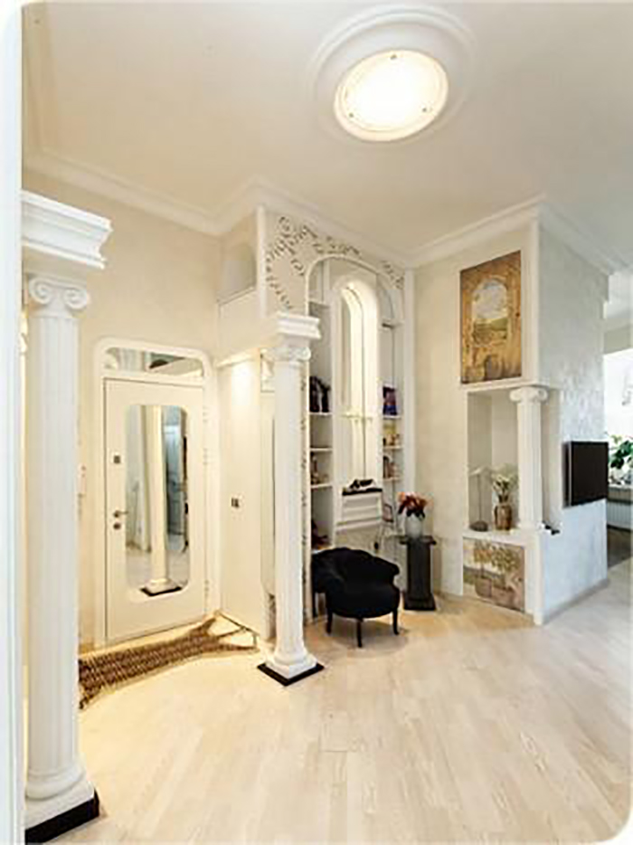 В интерьере две самостоятельные зоны, отделённые между собой вместительным холлом с белыми колоннами со встроенными нишами под аксессуары и сувенирные мелочи.