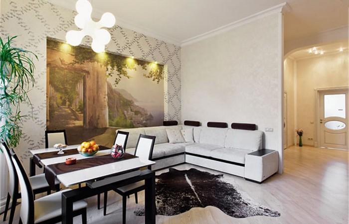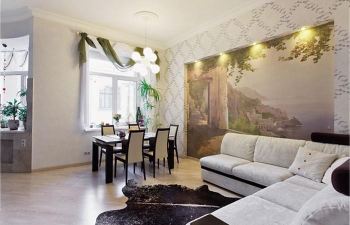 Пол в гостиной и столовой оформлен натуральным паркетной доской из ясеня. Мебели немного, но она максимально функциональна — раздвижной стол для приёма гостей, комфортный угловой диван. Центром притяжения стала фреска со средиземноморским пейзажем. Ольга обожает тёплые Испанию, Италию, Грецию.