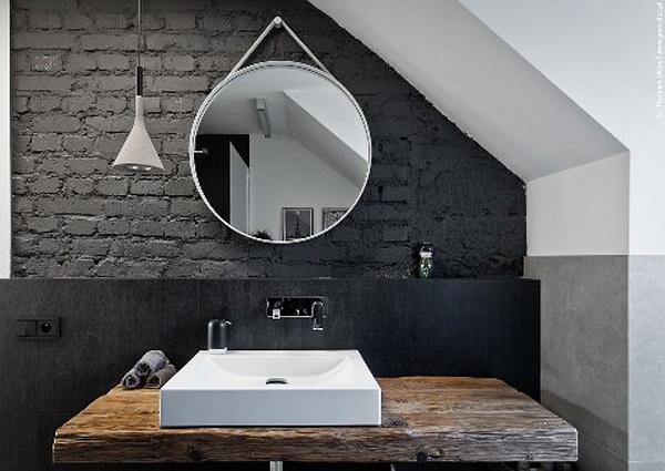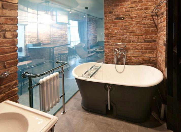 Ванна в стиле лофт не может быть без большого красивого зеркала, отражение в котором — неотъемлемая часть декора.
