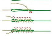 • продетым отрезком делается 6-7 оборотов вокруг основной части;• конец лески продевается в образовавшуюся петлю возле проушины;• конец продевается во вновь образованную петлю;