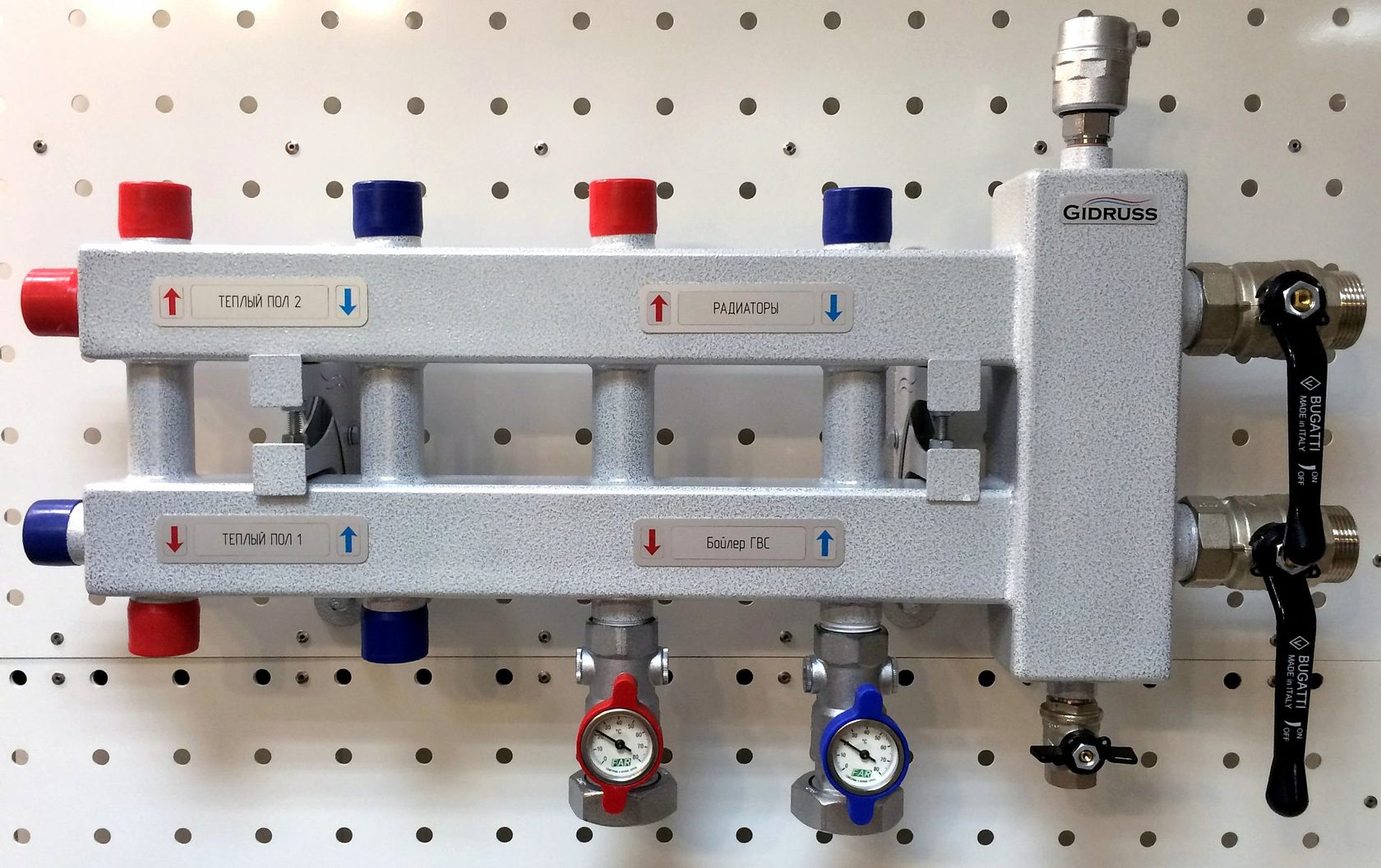 В некоторых случаях можно обойтись и без установки такой конструкции, но она рекомендуется, если в отоплении используется несколько насосов. Конструкция похожа на вилку с двумя зубцами, по верхнему идёт горячая вода, а по нижнему холодная. Она даёт возможность котлу выдавать нужный каждому конкретному контуру теплорасход не перегружаясь. Кроме того, в конструкции предусмотрены дополнительные клапаны, для спуска лишнего воздуха и слива загрязнений.