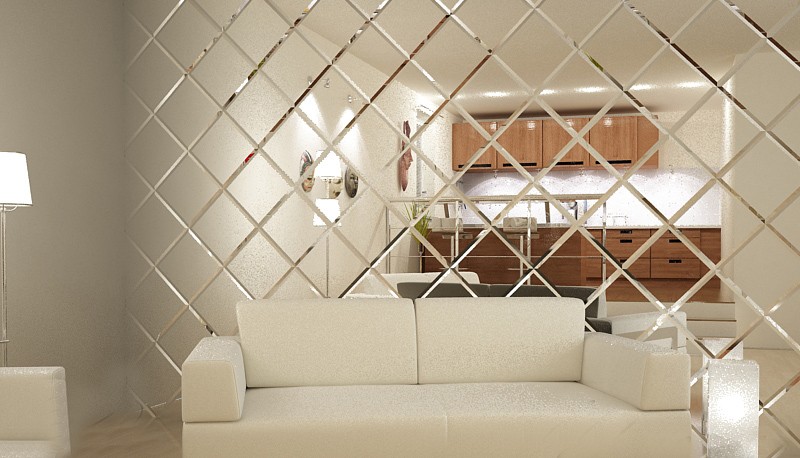 - Панель из зеркальных плиток, находящихся на расстоянии друг от друга (например, в шахматном порядке)– интересное решение для акцентной стены. Отдайте предпочтение плиткам с неровными, гранёными поверхностями, наклонёнными плоскостями; тогда комната наполнится множеством бликов, а отражения людей сведутся к нулю.